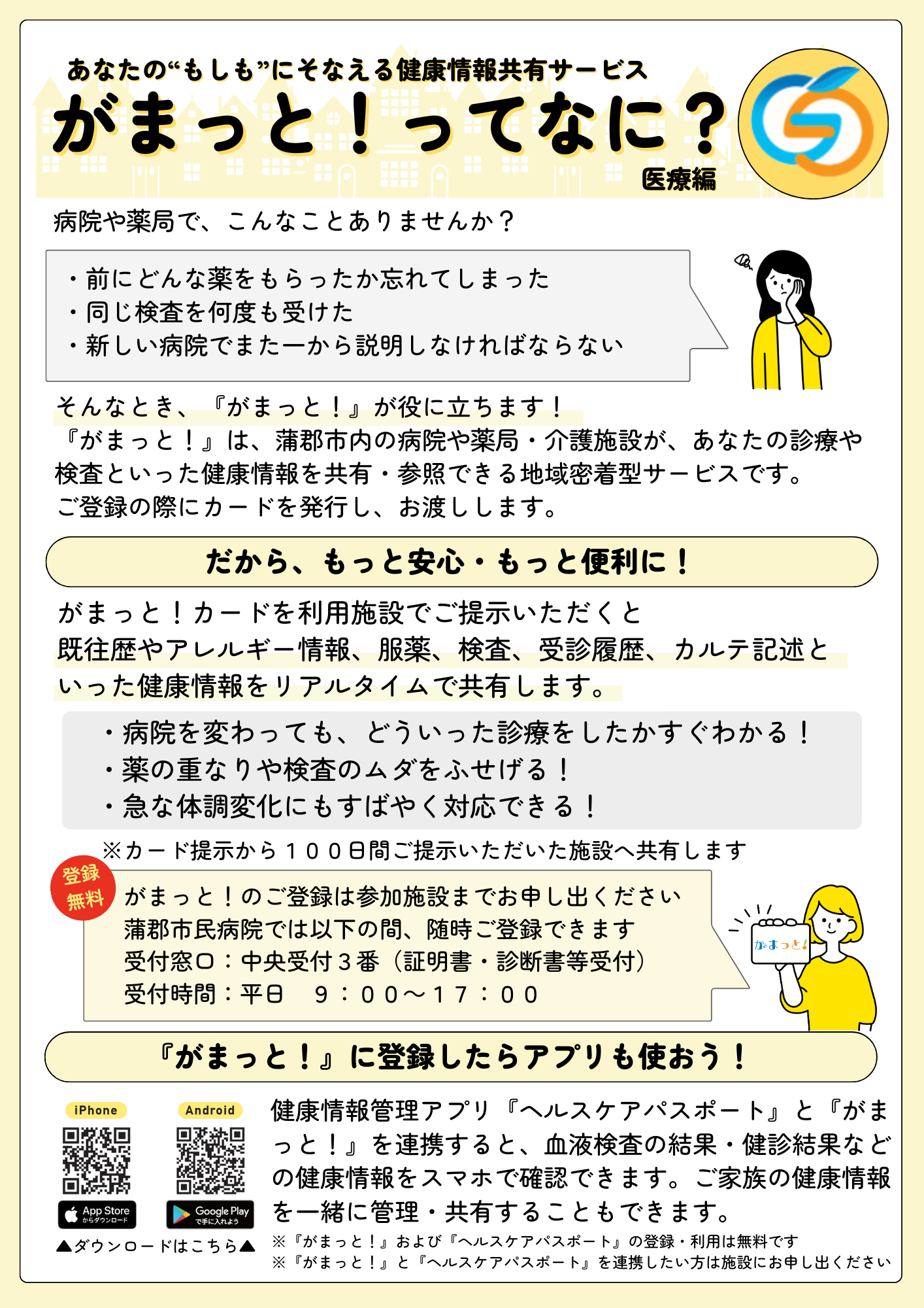 当院では救急外来受診後や退院後のかかりつけ医への通院や介護施設での介護がスムーズになるよう、『がまっと!』の登録をおすすめしています。