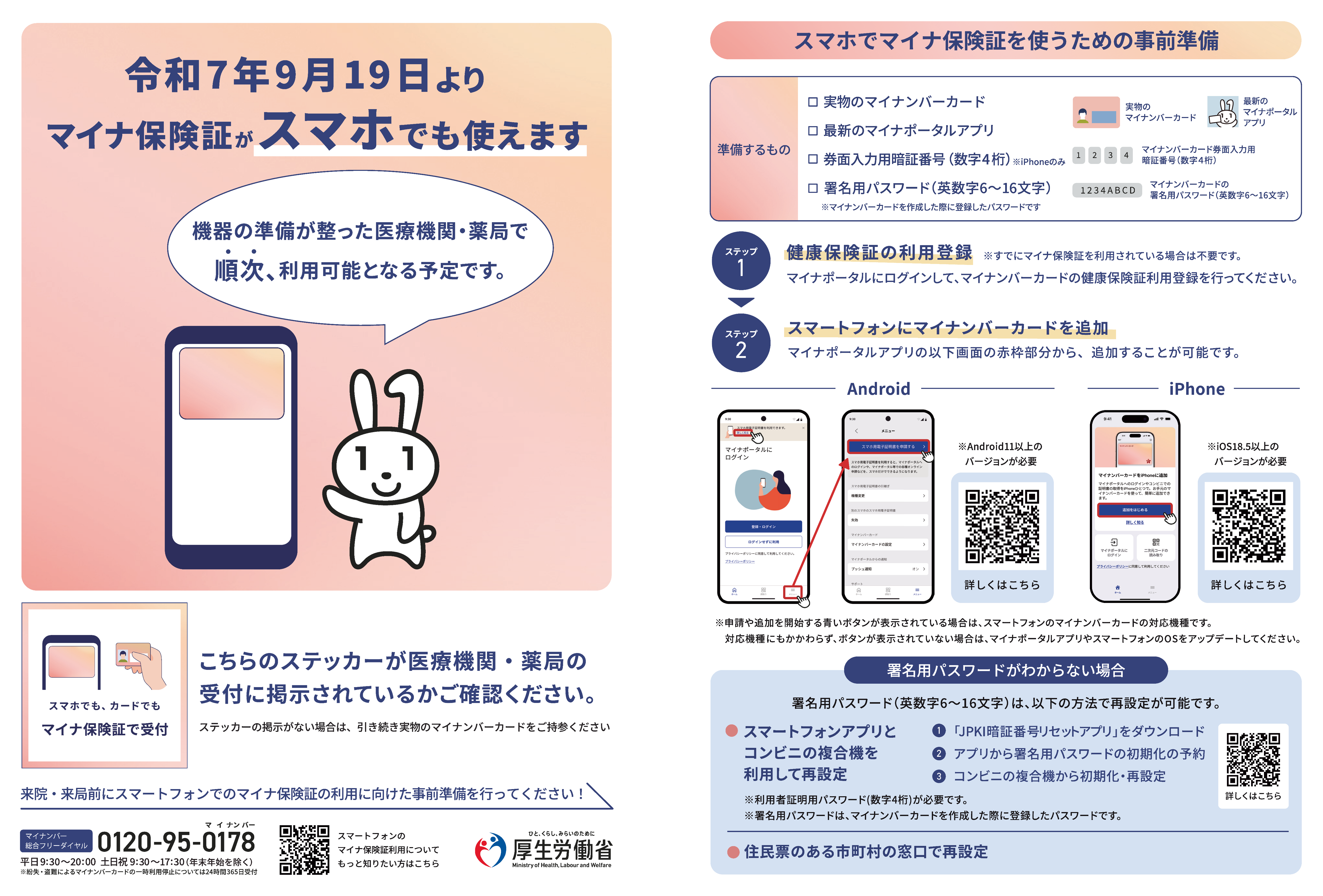スマートフォンのマイナ保険証もご利用いただけます。カードリーダー設置窓口にてご提示をお願いします。