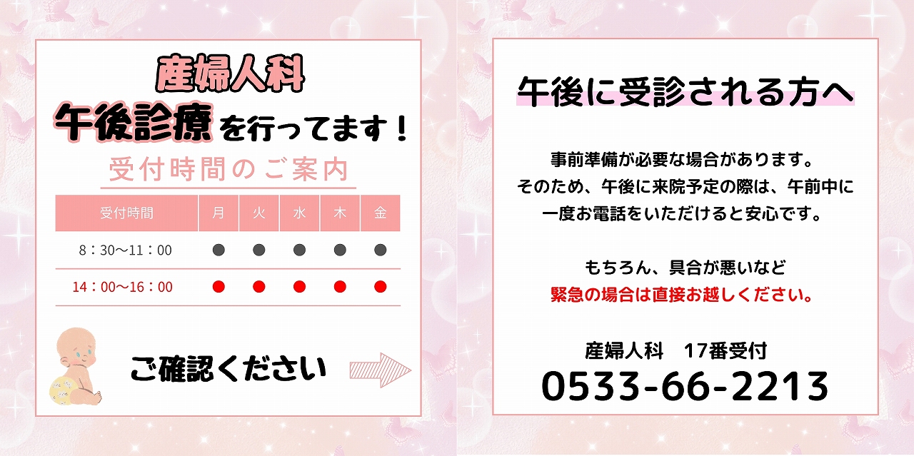 出産に関するご相談は産婦人科外来(0533-66-2200(代))へ