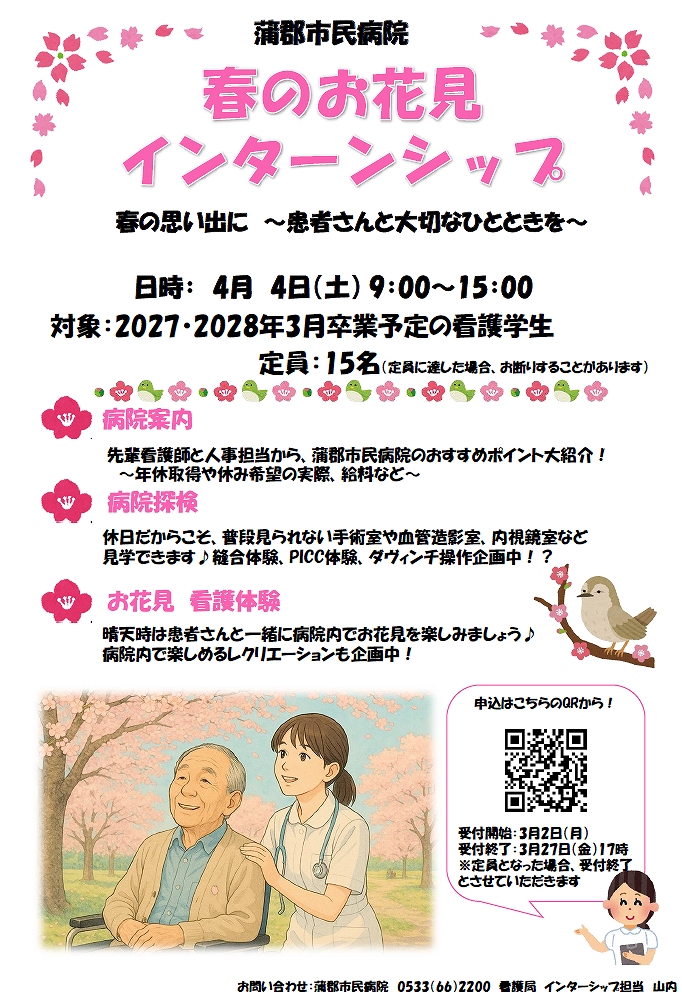 ホーム >  病院からのお知らせ >  看護学生対象の『春のお花見インターンシップ』を開催します!